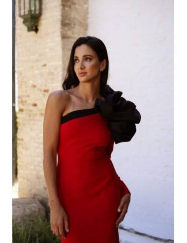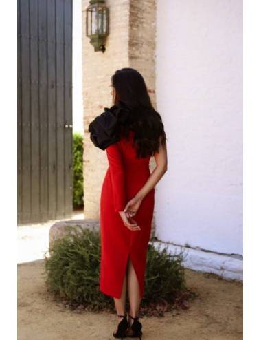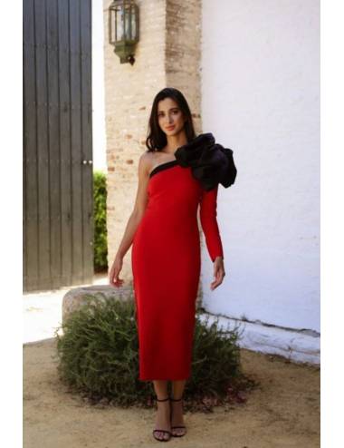 Vestido midi de diseño asimétrico, ideal para invitadas que buscan sofisticación y estilo. Su escote palabra de honor con un solo hombro resalta la feminidad, mientras que el gran adorno floral aporta un toque de impacto y distinción. Ajustado a la silueta y con abertura trasera, es perfecto para bodas, bautizos, comuniones o graduaciones, combinando elegancia, modernidad y personalidad única.