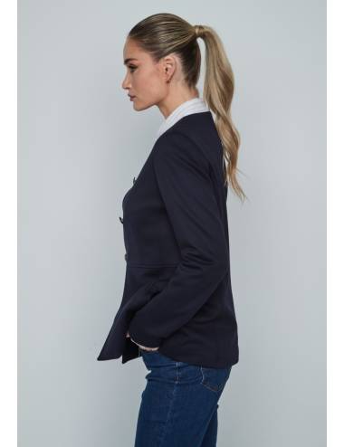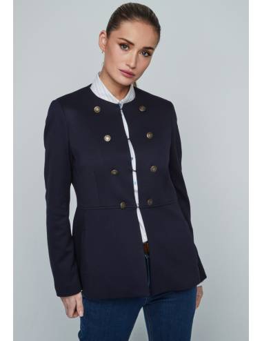 Chaqueta americana de estilo elegante y actual, diseñada con cuello redondo y cierre frontal de doble botonadura metálica que aporta un aire sofisticado. Su corte entallado realza la silueta, ofreciendo una combinación perfecta entre comodidad y estilo. Ideal para llevar con camisas y vaqueros o pantalones de vestir, es una prenda versátil para looks casuales o más formales.
