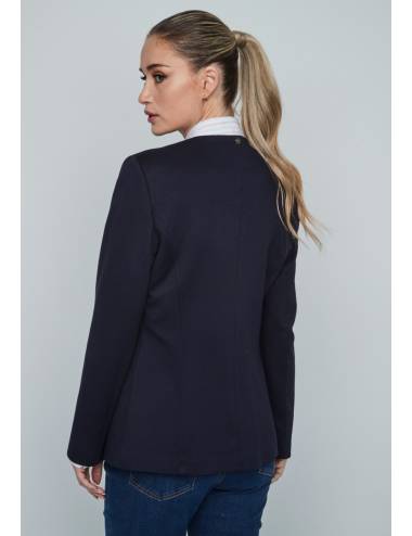 Chaqueta americana en color azul marino de corte entallado, con solapa clásica en pico y cierre de un solo botón. Incluye bolsillos con solapa y un detalle elegante de pañuelo rojo en el bolsillo superior, a juego con el pequeño adorno en forma de lazo en la solapa. Su interior forrado en rojo aporta contraste y sofisticación, convirtiéndola en una prenda versátil y distinguida para ocasiones formales y modernas.