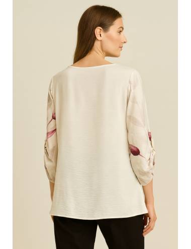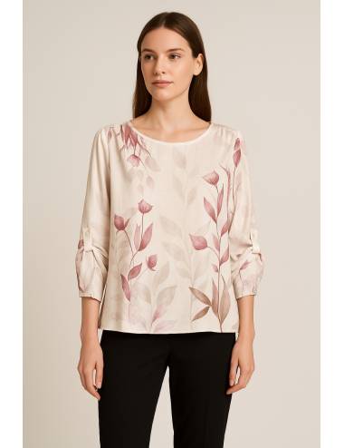 Blusa de fondo crudo con delicado estampado floral en tonos rosados y malva, ideal para un estilo femenino y elegante. Presenta cuello redondo sencillo y mangas tres cuartos con detalle de trabilla y botón, que aportan un toque moderno y versátil. Su diseño recto y fluido ofrece comodidad sin perder sofisticación, mientras que la parte trasera lisa realza la ligereza del tejido. Perfecta para combinar con pantalones o faldas y crear looks frescos y actuales.