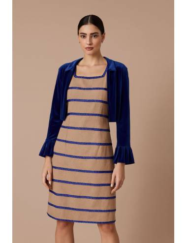Conjunto elegante y sofisticado compuesto por vestido recto de corte clásico con detalle de franjas en relieve y escote cuadrado, acompañado de una chaqueta corta en terciopelo de manga larga con puños acampanados. Una propuesta que combina la sobriedad con un toque de distinción, ideal para eventos especiales donde se busca un look refinado y con personalidad.