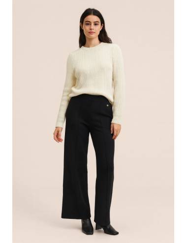 Pantalón negro de corte recto con detalle de costura central que estiliza la pierna y aporta un aire sofisticado. Su cintura elástica ofrece comodidad y ajuste perfecto, mientras que el diseño de pierna ancha lo convierte en una prenda versátil, ideal tanto para un look casual con jersey como para un conjunto más elegante con blusa y tacones.