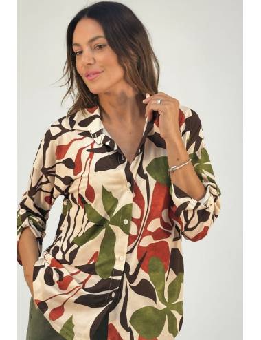 Blusa camisera de manga larga con diseño estampado de inspiración botánica en tonos tierra, verde oliva y rojo. Con cuello clásico, cierre de botones y un corte suelto y cómodo, aporta un estilo fresco y natural ideal tanto para looks casuales como más sofisticados. Perfecta para combinar con pantalones lisos y resaltar su estampado llamativo.