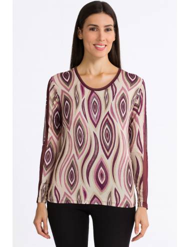 Blusa de manga larga con tejido ligero y estampado geométrico en tonos morados, fucsias y beige. El diseño juega con transparencias en las mangas que aportan un toque moderno y femenino. Su corte recto y estilizado la convierte en una prenda versátil, perfecta para combinar tanto con pantalón como con falda en looks elegantes o casuales.