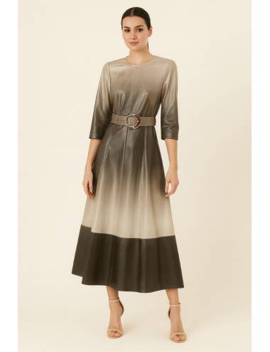 Vestido midi de efecto piel con diseño degradado, escote redondo y mangas tres cuartos. Incorpora un cinturón a juego que define la silueta y una falda con caída amplia que aporta elegancia y movimiento. Ideal para un look sofisticado y moderno.
