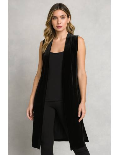 Chaleco largo de terciopelo sin mangas, con caída fluida y elegante. Una prenda versátil y sofisticada que aporta un toque moderno y estilizado, ideal para combinar con básicos o looks más arreglados.