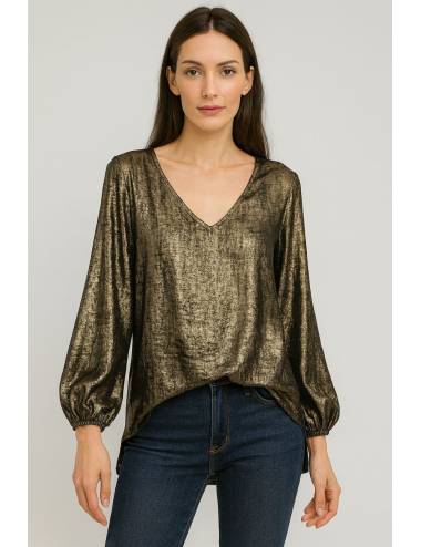 La blusa metálica de manga larga destaca por su tejido brillante y su corte suelto que aporta movimiento y elegancia. Con escote en pico y mangas abullonadas con puño elástico, resulta ideal para looks de noche o eventos especiales. Su acabado luminoso convierte esta prenda en un básico sofisticado que eleva cualquier conjunto con un aire moderno y chic.