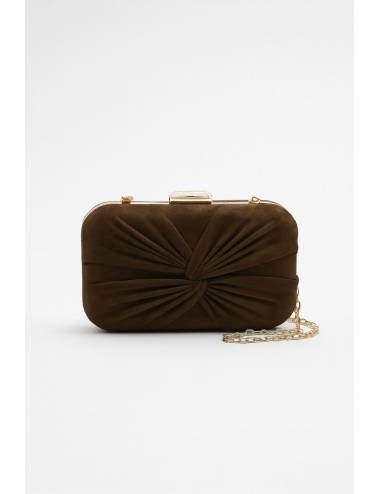 Clutch de ante marrón con diseño fruncido en forma de nudo central. Incorpora un elegante marco metálico dorado y cadena a juego que permite llevarlo de diferentes formas. Su estilo sofisticado y atemporal lo convierte en el complemento perfecto para ocasiones especiales y looks de fiesta.