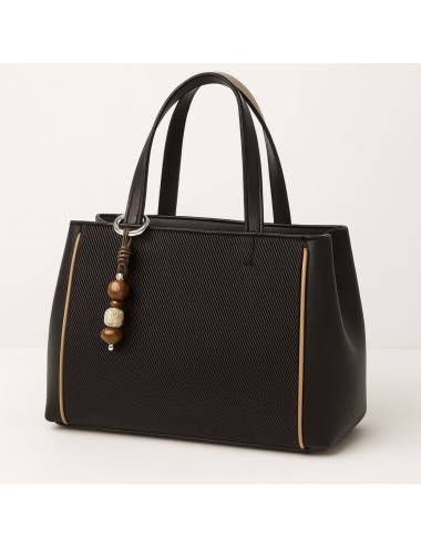 Este bolso combina elegancia y funcionalidad en un diseño atemporal. Con cuerpo texturizado y laterales en acabado piel, destaca por sus asas en contraste que aportan sofisticación y comodidad. Su adorno de cuentas artesanales añade un toque distintivo y original, perfecto para completar looks tanto de diario como de ocasiones especiales. Amplio, práctico y versátil, es un accesorio imprescindible para realzar cualquier conjunto.