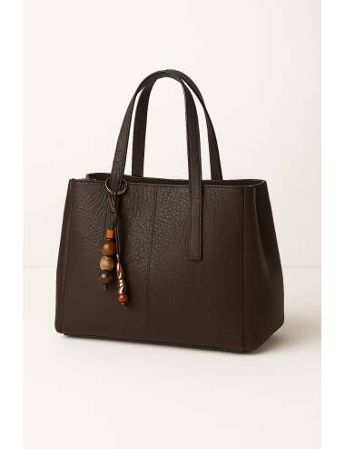Bolso tote de diseño elegante y estructurado, confeccionado en piel granulada con acabado sofisticado. Cuenta con asas dobles resistentes para un cómodo agarre y un colgante decorativo de cuentas que aporta un toque distintivo y artesanal. Su interior amplio y práctico lo convierte en un complemento versátil, ideal para el día a día o para dar un aire refinado a cualquier look.