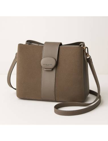 Bolso bandolera de diseño moderno y minimalista, confeccionado en una combinación de materiales lisos y aterciopelados que aportan contraste y elegancia. Destaca su correa ajustable, el cierre superior con cremallera y la pieza frontal decorativa que le añade un toque sofisticado. Un accesorio versátil, perfecto para llevar con estilo en cualquier ocasión.