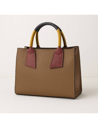 Bolso tote estructurado con acabado en textura granulada que destaca por sus asas de diseño tricolor, aportando un aire moderno y original. Su forma definida y práctica lo convierte en un accesorio ideal para el día a día, combinando estilo y funcionalidad con un toque sofisticado y atrevido.