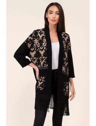 Una prenda elegante y versátil que combina un sofisticado estampado damasco en tonos dorados y negros con detalles artesanales en flecos. Su corte fluido y ligero aporta comodidad, mientras que el diseño abierto y los bolsillos frontales la hacen práctica y moderna. Ideal para dar un toque distinguido a cualquier look, ya sea casual o de ocasión especial.