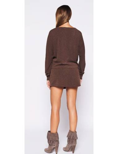 Conjunto de dos piezas en punto fino, compuesto por falda corta y top de manga larga con escote en pico y detalle de nudo. Incluye cinturón con hebilla circular que realza la cintura. Elegante, cómodo y perfecto para cualquier ocasión.