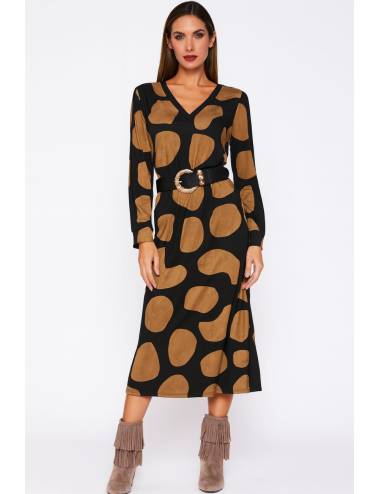 Elegante conjunto de dos piezas compuesto por blusa de manga larga con escote en pico y falda midi a juego. Su estampado geométrico en tonos camel y negro aporta un estilo moderno y sofisticado, mientras que el cinturón con hebilla dorada realza la cintura. Una opción versátil y cómoda, ideal tanto para eventos como para el día a día con un toque chic.