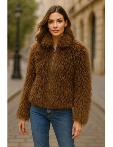 Chaqueta de pelo rizado en tono marrón, con cremallera frontal y diseño voluminoso que aporta un aire sofisticado y muy actual. Ideal para elevar cualquier look, combina perfectamente con vestidos largos de estampado boho o con prendas lisas para dar protagonismo a la chaqueta. Una prenda cálida, moderna y con mucho estilo, perfecta para destacar en los días más fríos.