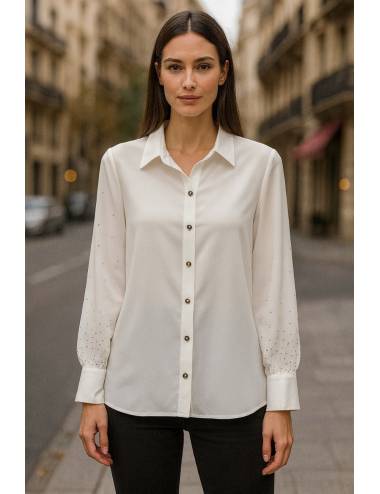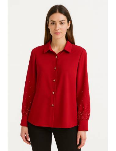 Blusa de manga larga en color rojo intenso, con botones al frente y detalles de pequeños brillantes en las mangas que aportan un toque sofisticado y elegante. De corte recto y cuello clásico camisero, es una prenda versátil que combina a la perfección con looks formales y casuales, aportando estilo y distinción en cualquier ocasión.