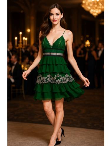 Vestido corto de fiesta en tono verde intenso, con un diseño juvenil y sofisticado. El cuerpo presenta escote en pico con delicantes tirantes finos y tejido de encaje que aporta un aire sensual y elegante. La falda está formada por volantes en capas, que generan movimiento y frescura en cada paso. Destaca la cinturilla entallada y el bordado floral plateado en la parte inferior, que realza el conjunto con un toque exclusivo y brillante. Ideal para eventos, bodas, comuniones o celebraciones especiales.