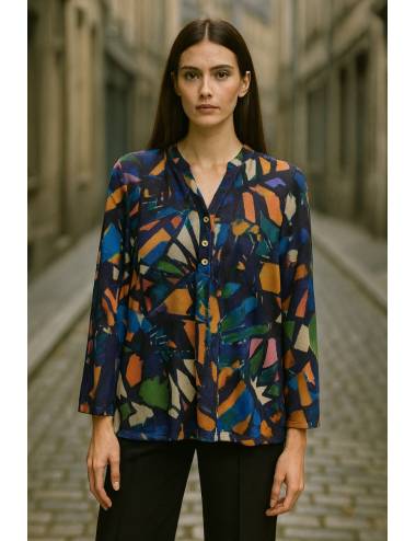 Blusa de manga larga con estampado abstracto multicolor en tonos azul, verde, naranja y beige sobre fondo oscuro. Presenta escote en pico con tapeta y botones dorados que aportan un detalle elegante. Su corte fluido y moderno la convierte en una prenda versátil, perfecta para looks urbanos con un toque sofisticado y artístico.