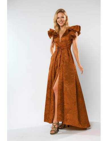 Vestido largo en tono verde oliva con tejido de jacquard satinado que aporta un elegante brillo y textura. Su diseño destaca por las voluminosas mangas con volantes, el escote en pico y un favorecedor fajín que define la cintura. La falda amplia con abertura frontal añade movimiento y sensualidad al conjunto. Ideal para invitadas que buscan un look sofisticado y con personalidad en bodas o eventos especiales.