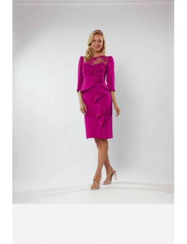 Un diseño sofisticado que combina un delicado encaje bordado en las mangas y el escote con una falda entallada de volantes asimétricos. Su corte favorecedor estiliza la figura, mientras que el detalle floral en la cintura aporta un toque romántico.