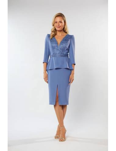 Vestido midi en tono malva con un diseño elegante y femenino. Presenta escote en pico decorado con apliques de encaje y pedrería que aportan un toque de brillo sutil. La cintura se realza con un delicado cinturón y un corte peplum que estiliza la figura. La falda recta con abertura frontal añade sofisticación y comodidad. Ideal para eventos de día, bodas o comuniones, combina elegancia clásica con un aire moderno y refinado.