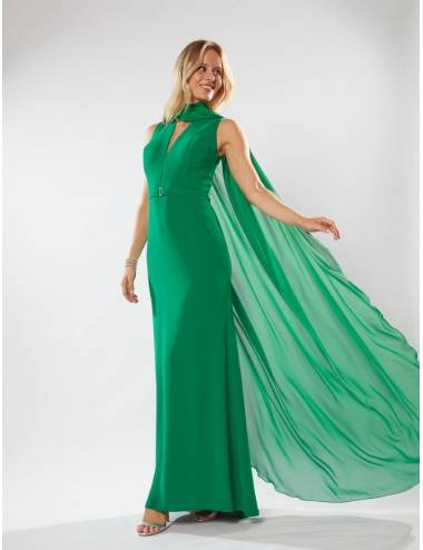 Vestido largo, cuello de pico, con cinturón y espalda al descubierto, con vuelo. muy juvenil.