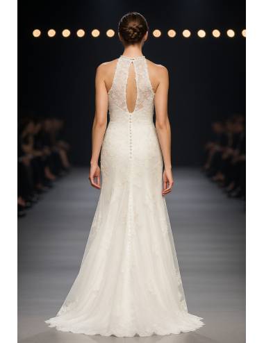 Deslumbra con la elegancia sutil de este vestido de novia de corte entallado y caída natural. Su diseño con cuello halter realza los hombros y el cuello, aportando una silueta estilizada y femenina. El cuerpo, delicadamente trabajado con encaje floral y pequeñas aplicaciones bordadas, se funde con una falda vaporosa que culmina en una cola suave y romántica.