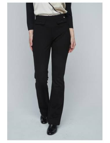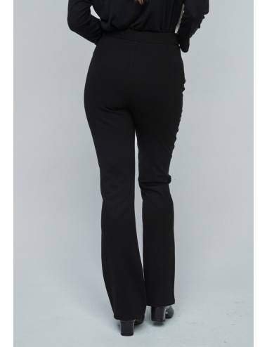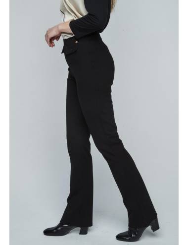 Pantalón negro de corte recto con ligera campana, confeccionado en tejido elástico que se adapta a la figura realzando la silueta. Presenta cintura media con detalles de solapa y botón decorativo, aportando un toque elegante y moderno. Ideal para combinar con blusas o tops, perfecto para un look urbano, profesional o casual chic.