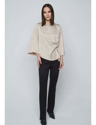 Blusa satinada de corte elegante con manga amplia y detalle fruncido lateral que realza la silueta de forma sutil y femenina. Su tejido fluido aporta una caída delicada, perfecta tanto para looks formales como casual chic. El tono neutro la convierte en una prenda versátil y sofisticada, ideal para combinar con pantalones o faldas en cualquier ocasión.