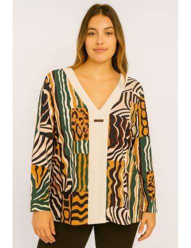 Blusa de estampado geométrico y animal print en tonos mostaza, verde, marrón y crema. Su escote en pico con detalle central alarga visualmente el cuello y estiliza la figura. Confeccionada en tejido fluido y ligero, es una prenda ideal para aportar color y personalidad a cualquier look, manteniendo un estilo elegante y moderno.