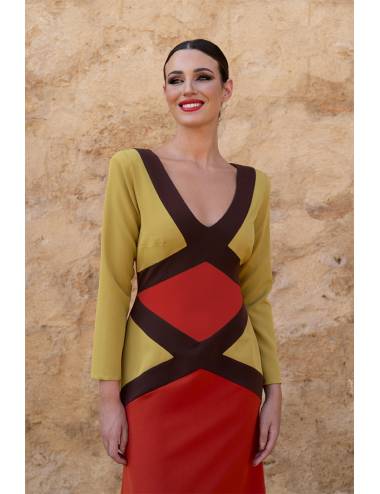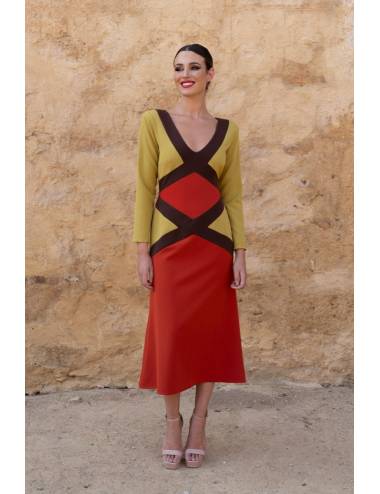 Vestido elegante y moderno con diseño geométrico en tonos mostaza oliva, caldera y marrón chocolate. De escote en pico y manga larga, realza la figura con un corte evasé que aporta movimiento y sofisticación. Ideal para eventos de día o celebraciones especiales.