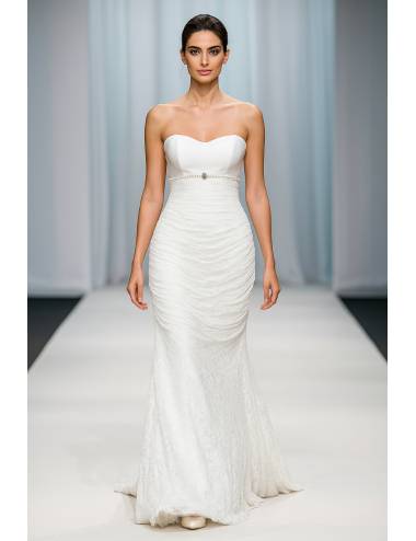 Elegante vestido de novia palabra de honor con cuerpo liso y detalle de perlas bajo el busto. Su falda de encaje presenta un delicado fruncido que estiliza la figura y una caída natural que realza la silueta. Perfecto para una novia sofisticada que busca sencillez, elegancia y un toque romántico.