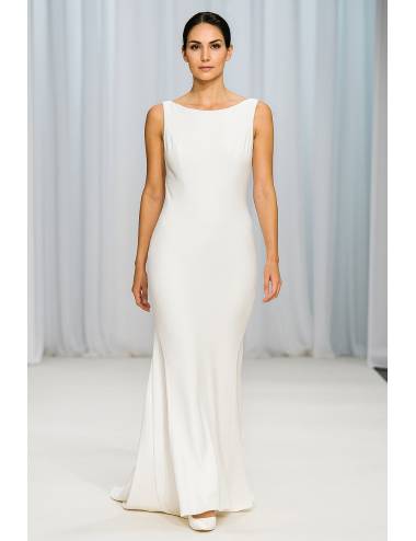 Vestido de novia de corte recto con espalda de tul transparente adornada con delicado encaje bordado y una hilera de botones forrados que recorren el centro. Su caída fluida y elegante aporta movimiento y sutileza, ideal para una novia moderna que busca sofisticación con un toque romántico.