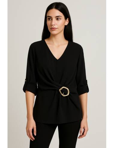 Blusa elegante y versátil con escote en pico que realza el cuello y aporta un toque femenino. Su diseño destaca por un drapeado central que se recoge con una hebilla metálica irregular, aportando sofisticación y estilo. Las mangas tres cuartos, con detalle de botón en los puños, permiten un ajuste cómodo y moderno. Ideal para combinar tanto con pantalones ajustados como con faldas, perfecta para looks de oficina o eventos especiales.