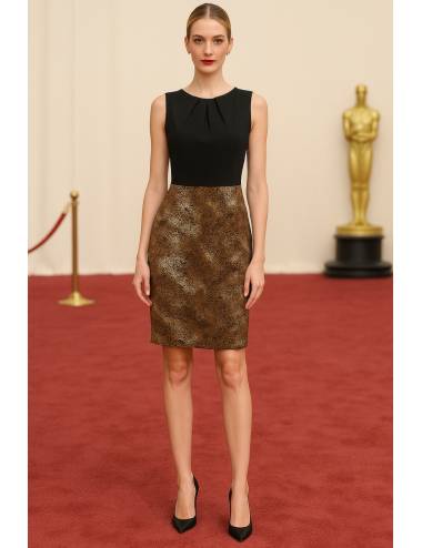 Vestido elegante y sofisticado con cuerpo negro liso y falda de estampado animal en tonos dorados y marrones. Su corte recto realza la silueta con estilo y sobriedad, ideal para eventos de noche o cóctel. El contraste entre la parte superior minimalista y la falda estampada aporta un toque moderno y distinguido.