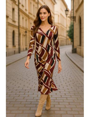 Vestido de estilo moderno y favorecedor, con un diseño entallado que realza la silueta sin perder comodidad. Su tejido ligero y el escote en pico aportan un toque femenino, mientras que el estampado geométrico lo convierte en una prenda con personalidad y elegancia. Perfecto para combinar con botas altas, creando un look actual, sofisticado y lleno de estilo para el día o la noche.