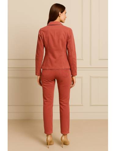 Traje de dos piezas confeccionado en tejido de ante color camel, compuesto por americana entallada y pantalón recto. La chaqueta cuenta con solapas clásicas, cierre de un botón y costuras que estilizan la silueta, mientras que el pantalón de corte slim aporta un acabado sofisticado y moderno. El conjunto se completa con tacones en tono nude, creando un look elegante, versátil y muy favorecedor para cualquier ocasión.