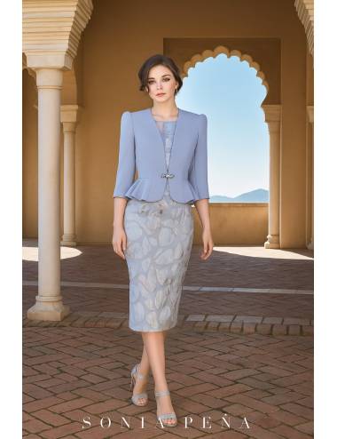 Conjunto elegante y refinado confeccionado en tejido brocado con relieves en tonos azul empolvado y matices nacarados. El vestido, de corte lápiz y cuello redondeado, realza la silueta con sutileza y clase. Una propuesta sofisticada y femenina, perfecta para invitadas y madrinas que buscan un estilo distinguido y atemporal para bodas o eventos de día.