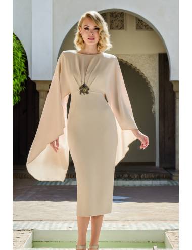 Este diseño destaca por su elegancia atemporal y su delicadeza en los detalles. De corte recto y largo midi, envuelve la figura con una caída fluida que aporta movimiento y sofisticación. Las mangas con caída en cascada añaden un toque romántico, mientras que el frunce central con un broche de pedrería dorada ilumina el conjunto con sutileza. Su escote redondeado suaviza el rostro y equilibra el diseño, creando una prenda ideal para ocasiones especiales o eventos de día donde se busca distinción, estilo y refinamiento sin excesos.