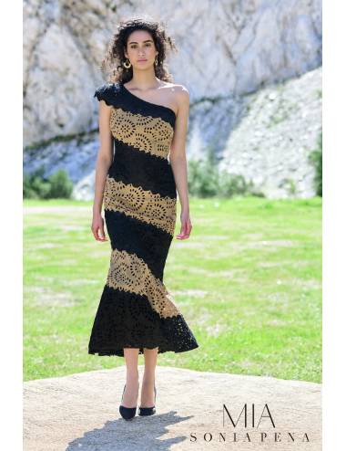 Vestido asimétrico de diseño exclusivo que combina elegancia y originalidad. Su corte entallado realza la figura y se abre suavemente en la parte inferior, aportando movimiento y sofisticación. Destaca por el contraste de sus franjas caladas con dibujo floral, que añaden textura y un toque artesanal. Ideal para eventos de día o de noche, con un aire distinguido y moderno.