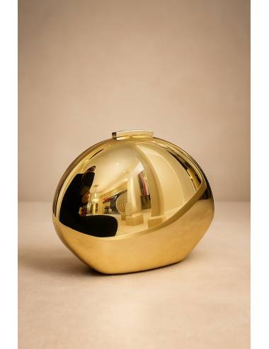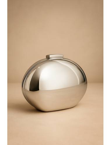 Clutch de diseño sofisticado con acabado efecto espejo que aporta un toque moderno y elegante. Su estructura ovalada y líneas pulidas lo convierten en una pieza atemporal, perfecta para complementar looks de noche o de ceremonia. Un accesorio que destaca por su brillo, su estilo minimalista y su gran versatilidad.