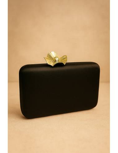 Este clutch negro destaca por su elegancia minimalista y su forma rectangular de líneas suaves. El cierre joya en dorado, con diseño de pétalo plisado y centro brillante, aporta un toque de lujo y distinción. Su acabado mate y su estructura rígida lo convierten en el complemento ideal para invitadas que buscan sofisticación y estilo en cualquier evento.