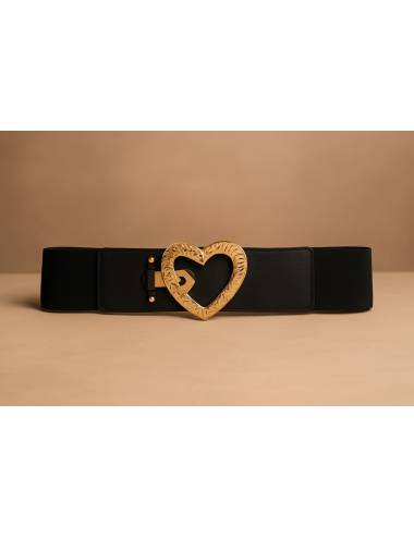 Cinturón ancho de diseño elegante, elaborado en tejido flexible que se adapta cómodamente a la cintura. Destaca su hebilla central en forma de corazón, con un acabado texturizado que aporta un toque sofisticado y femenino. Es un accesorio ideal para realzar vestidos, monos o conjuntos, aportando estilo y definición a la silueta con un cierre práctico y decorativo. Ideal para ocasiones especiales o para dar un punto chic a cualquier look.