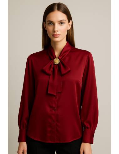 Esta blusa de tejido satinado destaca por su elegancia atemporal y su caída suave que estiliza la figura. El lazo delantero, rematado con un broche ornamental, aporta un toque distinguido y muy sofisticado. Su diseño estructurado, con mangas ligeramente abullonadas y puño marcado, realza cualquier look, convirtiéndola en una prenda versátil y perfecta para eventos o estilismos de vestir.