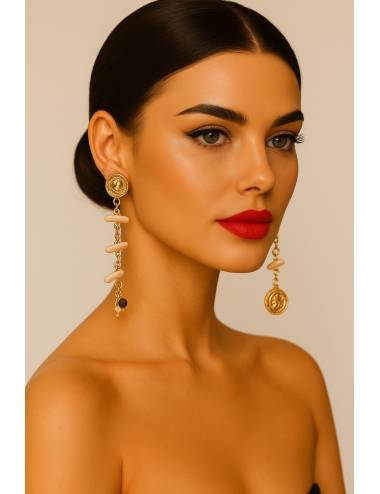 Pendientes largos de diseño exclusivo, formados por una pequeña moneda grabada que aporta un toque clásico y sofisticado. De ella desciende una fina cadena dorada adornada con piezas irregulares en tono marfil y pequeños detalles decorativos que añaden movimiento y personalidad. El colgante final, una medalla trabajada con relieve, completa un accesorio delicado, femenino y lleno de estilo, ideal para elevar cualquier look especial.