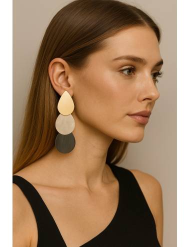 Estos pendientes combinan tres lágrimas superpuestas en un diseño moderno y muy elegante. La pieza superior aporta un brillo suave y sofisticado, seguida de una lágrima central con acabado nácar que ilumina el rostro. La última pieza, más oscura, equilibra el conjunto y añade profundidad. Su estilo ligero, geométrico y armonioso los convierte en el complemento perfecto para elevar cualquier look con un toque chic y contemporáneo.