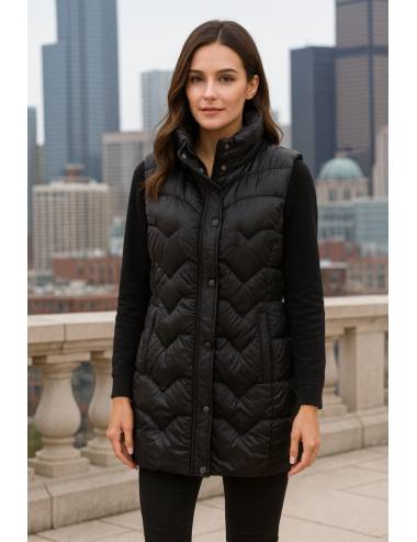 Este chaleco acolchado destaca por su diseño largo y estilizador, con pespuntes en forma de “V” que realzan la figura. Lleva bolsillos laterales prácticos, cierre delantero con botones a presión y un cuello alto que aporta calidez y un toque moderno. Ideal para combinar con looks casuales y crear un estilo elegante y actual.
