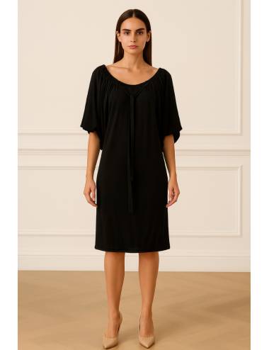 Este vestido destaca por su caída suave y su diseño relajado que estiliza la figura con naturalidad. El escote amplio con frunce aporta un toque femenino, mientras que las mangas fluidas añaden movimiento y sofisticación. La lazada frontal crea un detalle sutil que completa un look cómodo, moderno y perfecto para cualquier ocasión con estilo.