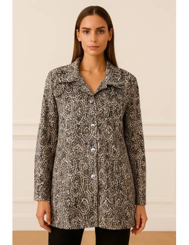 Esta chaqueta destaca por su estampado dinámico y elegante, acompañado de un diseño recto que estiliza la figura. El cuello amplio aporta un toque sofisticado y los nuevos botones metálicos realzan su acabado refinado. Es una prenda versátil, perfecta para combinar con looks formales o más casuales, siempre aportando estilo y personalidad.